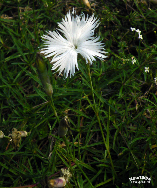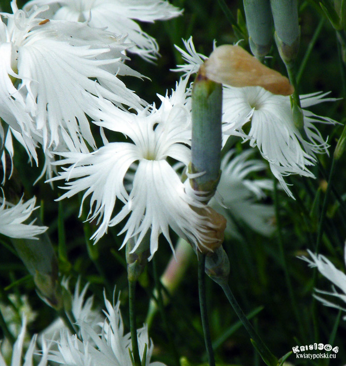 | OPIS | Przeważnie pojedynczy kwiat na szczycie łodygi, czasami tylko występują 2, lub jeszcze rzadziej 3 kwiaty. Kielich sztywny, cylindryczny, zrosły, ząbkowany o działkach zrośniętych w rurkę, zielony lub purpurowo nabiegły. Otoczony jest kilkoma łuskami podkwiatowymi tworzącymi tzw. przykieliszek. 5 białych lub różowawych płatków korony ma brzegi nierówno strzępiasto powcinane (co najwyżej do 1/3 długości płatka). Po stronie wewnętrznej w połowie długości posiadają różowe lub purpurowe włoski. Słupek z dwoma szyjkami i 10 pręcików o liliowych pylnikach. Owocem jest podłużna torebka otwierająca się 4-ząbkami.