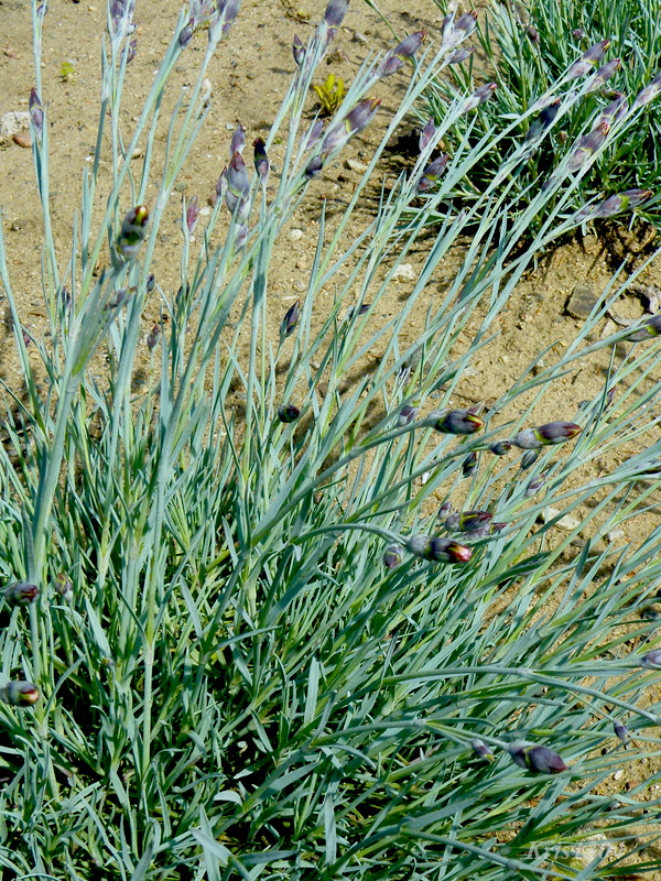 | LIŚCIE | Naprzeciwległe, równowąskie, ostro zakończone, 3-5 nerwowe. Mają szerokość do 2 mm i podobnie jak łodyga siny kolor i również są delikatnie woskowane.