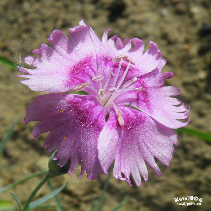 | OPIS | Kwiaty - zazwyczaj na szczycie łodygi występuje pojedynczy kwiat o średnicy 1,5-3 cm u dziko rosnącego gatunku. Silnie i przyjemnie pachnie. Pod kielichem występują łuski podkielichowe 2-4 razy krótsze od kielicha. 5 różowych płatków korony, które w gardzieli sa nieco brodate, zaś na zewnętrznym końcu są ząbkowane co najwyżej do 1 długości płatka. U typowego gatunku dziko rosnącego kwiaty mają jasnoróżowy kolor, u odmian ogrodowych kwiaty mają kolor od białego do czerwonego.
