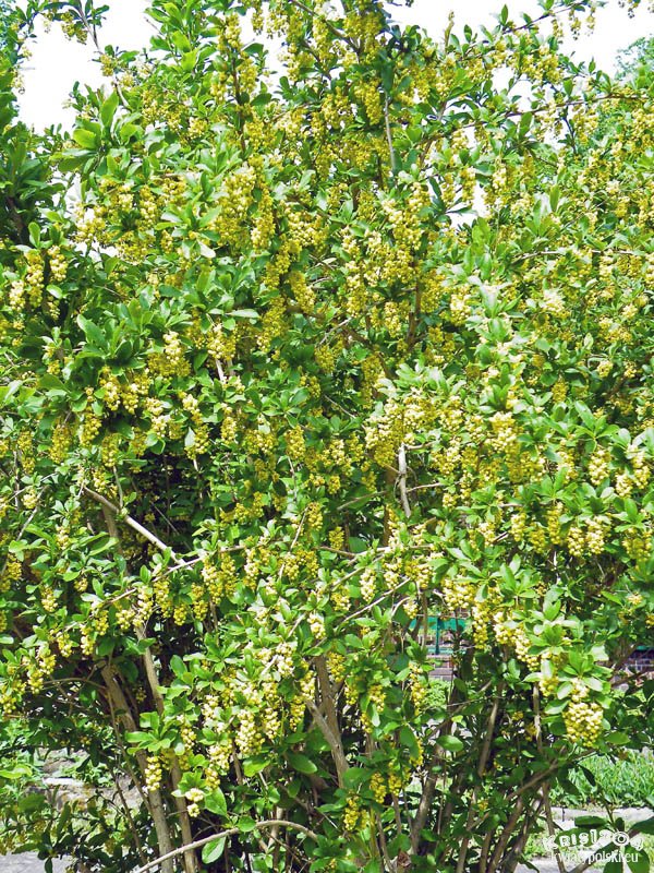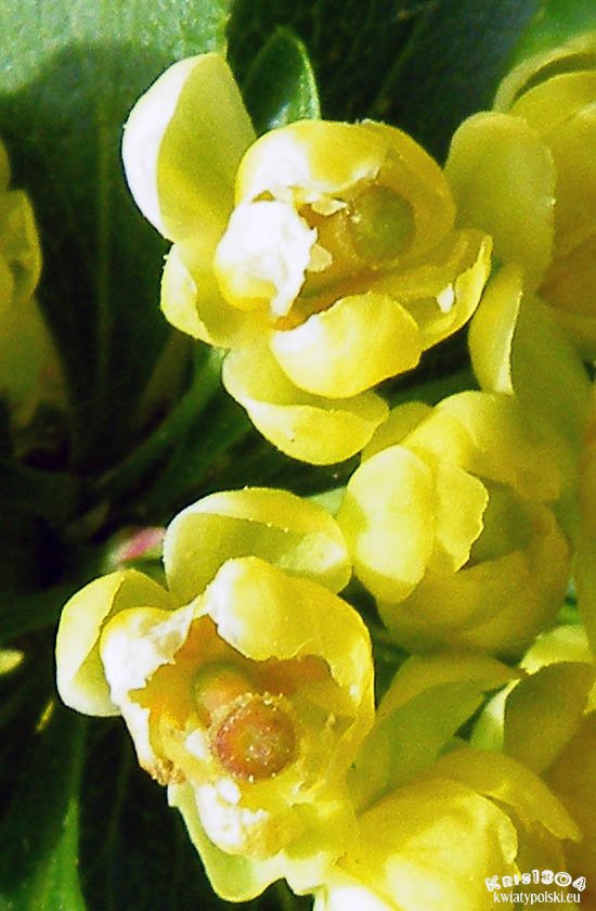 | OPIS | Kwiaty pachnące, żółte z trzema płatkami korony wykształconymi jak działki kielicha i z sześcioma miodnikami wyglądającymi jak płatki korony, zebrane w zwisające grona o długości do 5 cm.
