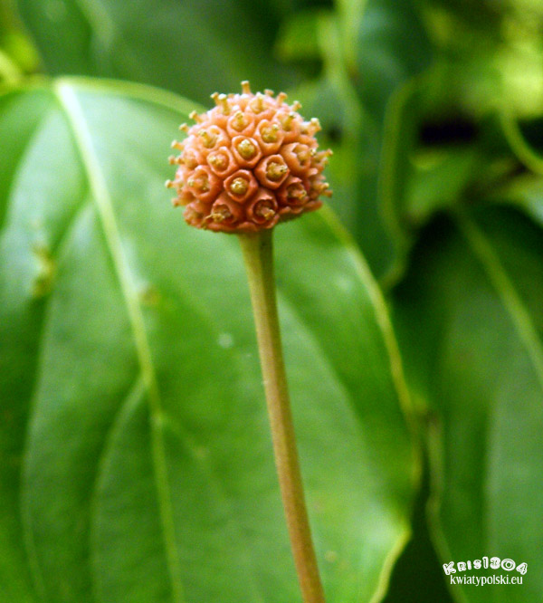 | OPIS | Charakterystyczne są kuliste kwiatostany o średnicy ok. 3 cm, znajdujące się na wierzchołkach pędów. Składają się z drobnych, kremowobiałych, pachnących, obupłciowych, zrosłopłatkowych kwiatów.