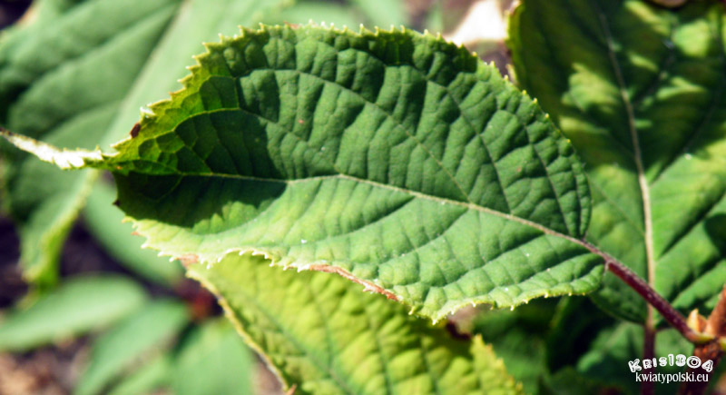| LIŚCIE | Liście duże, owalne, o krwistoczerwonych ogonkach i czerwonawo podbarwione na brzegach, jesienią zmieniają barwę na żółtpomarańczową.
