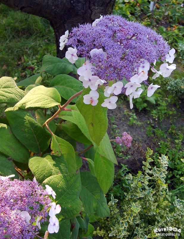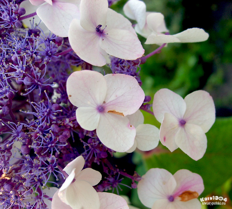 | OPIS | Koronkowe kwiatostany mają około 25 cm średnicy, ale mogą dorastać do 30 cm. Kwiaty płodne są bardzo liczne, jasnopurpurowe, jasnofioletowe, fioletowo-niebieskie. Nieliczne, duże (o średnicy 3-5 cm) kwiaty płonne wyrastające na obrzeżu kwiatostanu najpierw są białe, później jasnoliliowe i otwierają się przed kwiatami płodnymi.