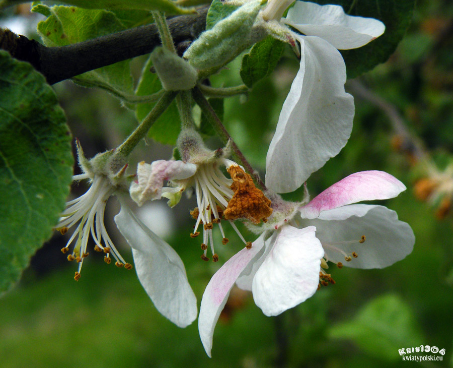 | OPIS | Rozwijają się wiosną równocześnie z liśćmi, osiągają średnicę 2,5-3,5 cm. Korona pięciopłatkowa, płatki biało-różowe, wyraźne słupki i żółte pylniki.