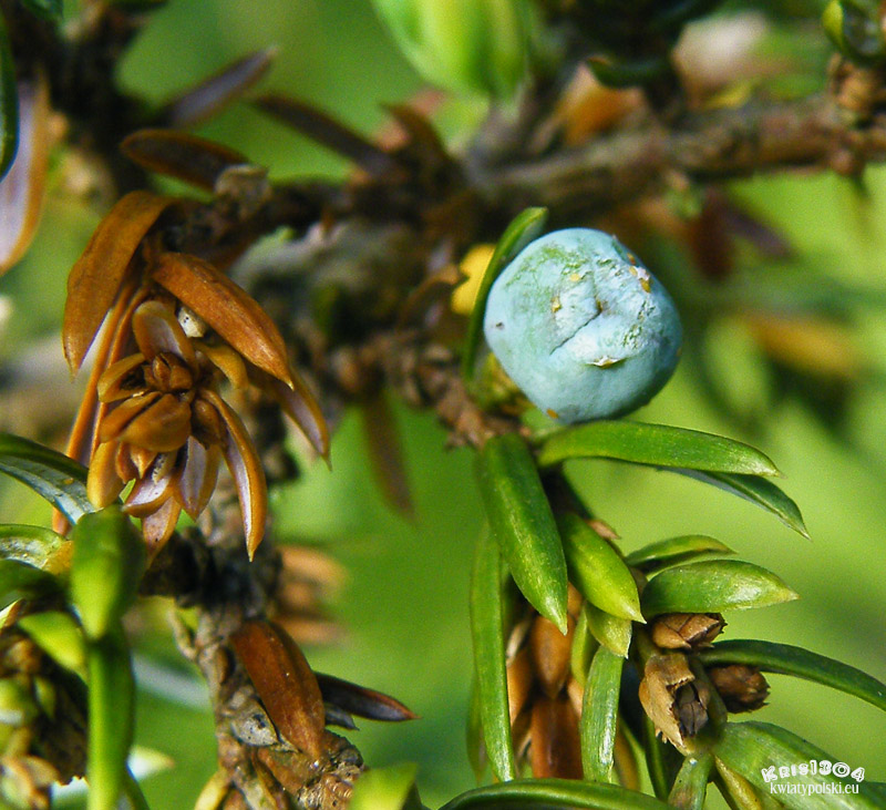 | OWOCE | Odpowiednikami owoców są tzw. szyszkojagody - kuliste utwory wielkości ziarna grochu (o średnicy 6-9mm), zbudowane z trzech nasion otoczonych przez zamkniętą, mięsistą osnówkę. Szyszkojagody ciemnoniebieskie (przed dojrzeniem zielone), pokryte woskowatym nalotem, osadzone na bardzo krótkich szypułkach, mało soczyste i nieprzyjemne w smaku. Nasiona wydłużone, łagodnie trójkanciaste, jasnobrązowe, posiadają twardą łupinę i są pokryte gruczołkami zawierającymi olejek eteryczny.
