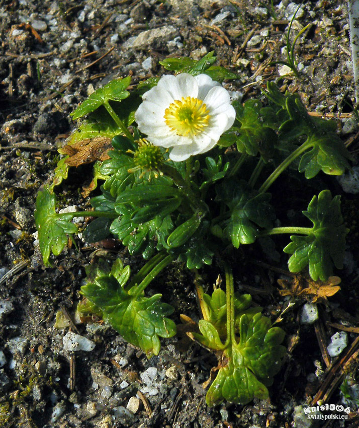 | OPIS | Jest jednym z nielicznych krajowych gatunków jaskrów o białych kwiatach. Na szczycie każdej łodyżki kwiatowej wyrasta pojedynczy, biały kwiat o średnicy 1 - 2 cm. Kielich jest nagi z zewnątrz. Korona kwiatu składa się z 5 jajowato-sercowatych płatków z wycięciem na szczycie. Kielich ma 5 wolnych, wgłębionych miseczkowato działek, które opadają bardzo wcześnie, bo zaraz po rozwinięciu się pączka kwiatowego.