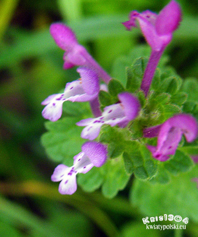 | OPIS | Kwiaty bladopurpurowe, wyrastają w okółkach w kątach liści na szczycie łodygi. Mają wyraźnie grzbiecistą, dwuwargową budowę, przy czym warga górna jest ciemniejsza, dolna jest plamista. Korona kwiatu o długości do 2 cm, o rurce dużo dłuższej od kielicha, który jest trwały, zrosłodziałkowy. Rurka korony wewnątrz nie posiada włosków.