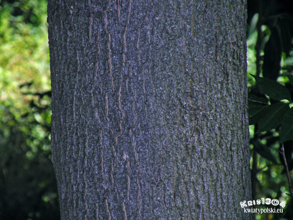 | KORA, PĘDY | Kora młodych drzew najpierw oliwkowozielona i gładka, potem popielata do srebrzystoszarej i nadal gładka, z wiekiem staje się brunatnoszara do czarniawej i niezbyt głęboko, podłużnie bruzdowana. Gęste bruzdy tworzą na pniu i starych konarach charakterystyczny dla jesionów, siatkowaty wzór. Młode pędy grube, nieco spłaszczone i wyraźnie rozszerzone w węzłach, początkowo żywozielone, potem jasnoszare i punktowane białawymi przetchlinkami, nagie. Pąki bardzo charakterystyczne - matowoczarne, szczytowy duży i gruby, szerokostożkowaty, często czterokanciasty, ostro zakończony, okryty czterema łuskami, dwa boczne (naprzeciwległe) w kątach liści zazwyczaj mniejsze, półkuliste lub szerokostożkowate, dwu-łuskowe.