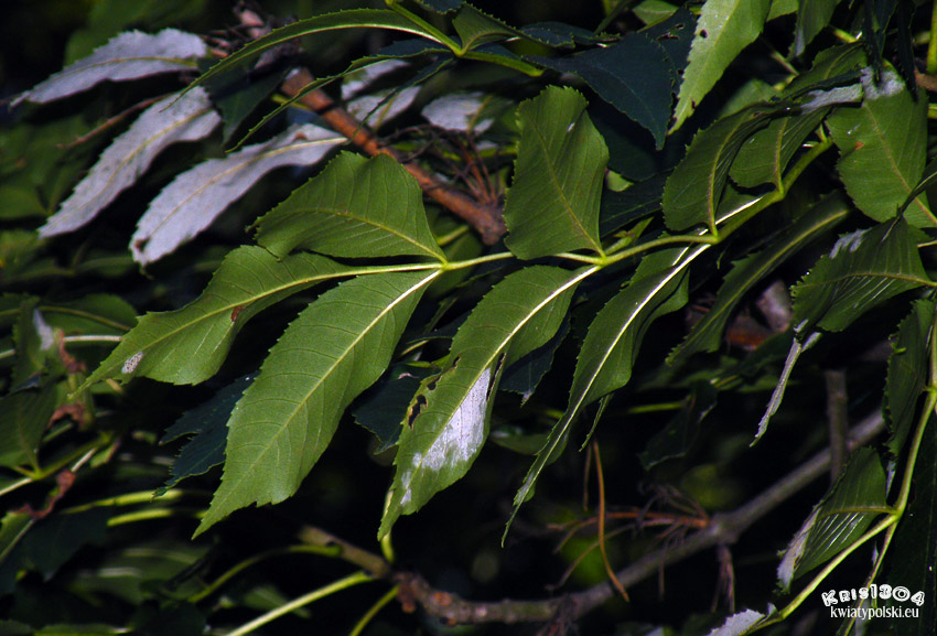 | LIŚCIE | Blaszkowate, nieparzystopierzaste, złożone z 9-11 listków, duże, długości całkowitej 20-30 cm. Listki wąskoeliptyczne, na końcu długo zaostrzone, długości 4-10 cm, o ostro, ale płytko karbowano-piłkowanym brzegu, jasno- do ciemnozielonych, nagie (z wyjątkiem środkowego nerwu na spodzie), prawie siedzące (z wyjątkiem listka szczytowego mającego nieco dłuższy ogonek). Ustawienie naprzeciwległe na długich ogonkach.