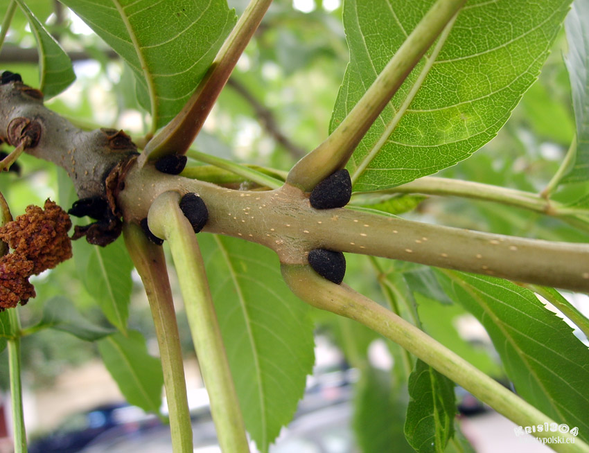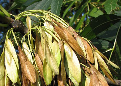 | OWOCE | Tzw. samary - pojedyncze, języczkowate skrzydlaki zebrane w gęste wiązki. Są tworzone w bardzo dużych ilościach. Składają się z jednonasiennego, płaskiego orzeszka opatrzonego języczkowatym, wąsko zaostrzonym u podstawy i łagodnie zaokrąglonym przy końcu skrzydełkiem długości 2.5-4 cm. Kolor skrzydlaków w młodości intensywnie zielony, następnie żółtawy, po dojrzeniu - jasnobrązowy.