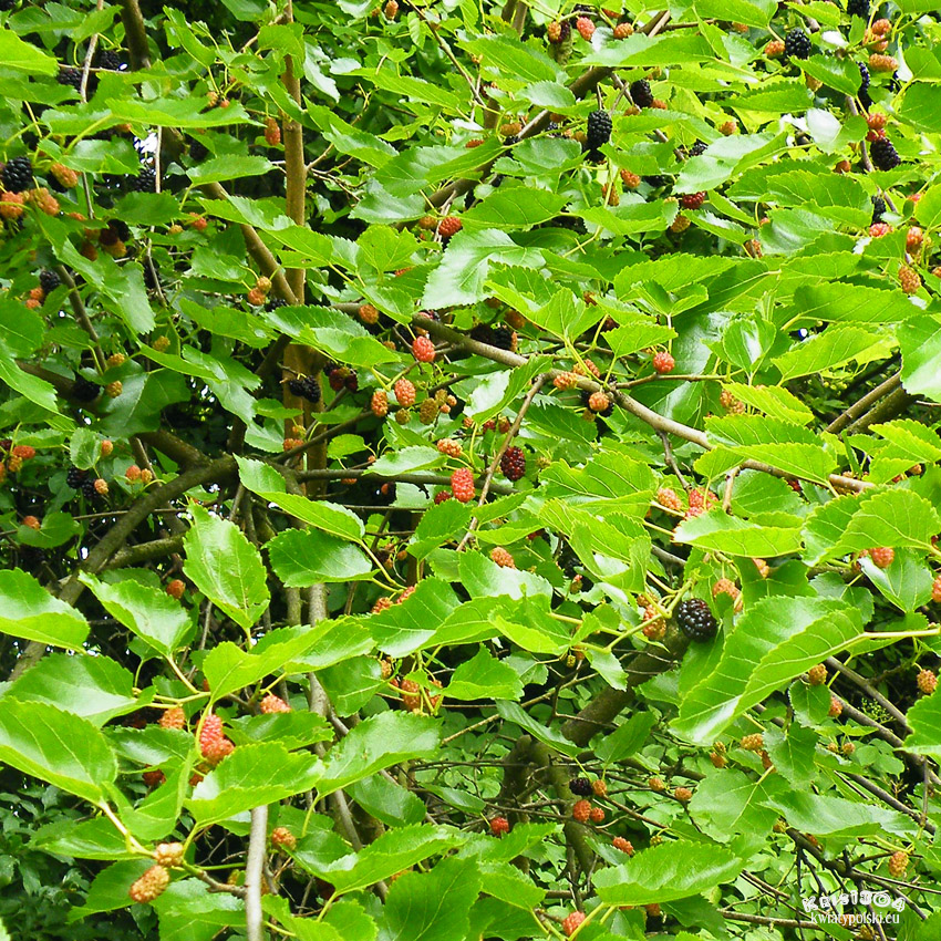 'Black Satin' - odmiana amerykańska, silnie rosnąca o dużych, błyszczących owocach, które dojrzewają w połowie sierpnia.
