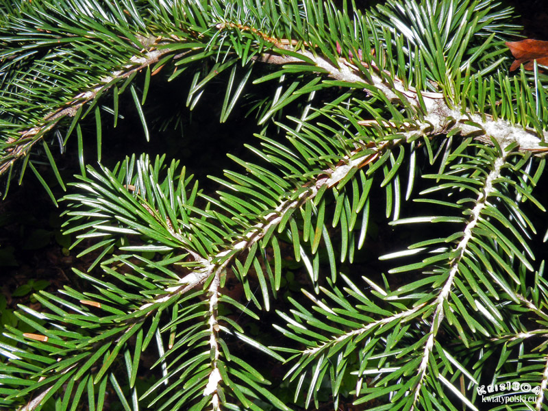 | LIŚCIE | Ułożone promieniście wokół pędu sztywne igły o długości 2-3 cm. Ich górna powierzchnia jest błyszcząca, zielona, na dolnej są dwa białe, równoległe paski. Brzeg skórzasty, matowy.