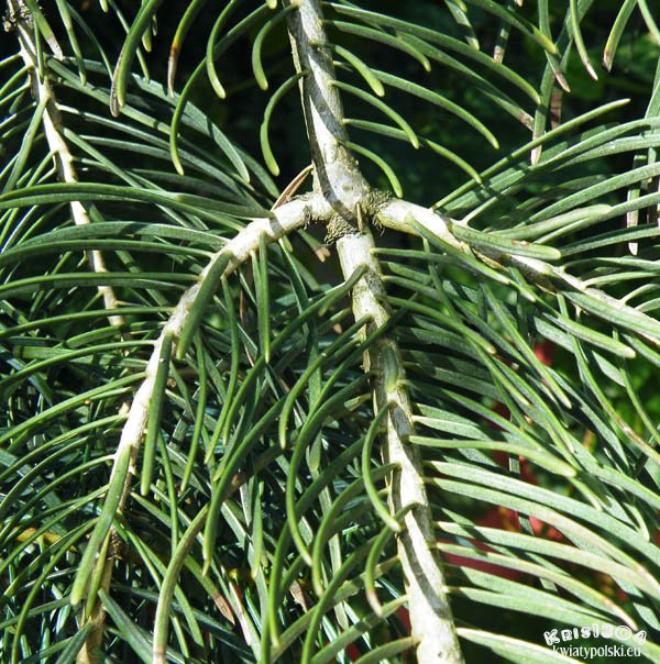 | LIŚCIE | Bardzo długie igły (4-7 cm), miękkie, szablasto wzniesione, z zaokrąglonymi wierzchołkami, z obu stron szarozielone lub niebieskawe.