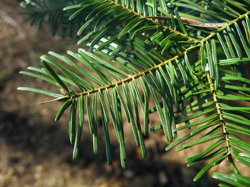 | LIŚCIE | Igły są wyjątkowo regularnie, płasko i grzebieniasto rozłożone tak jak u jodły pospolitej, ale długie, w dolnej warstwie do 6-8 cm długości, w górnych znacznie krótsze. Są błyszczące i ciemnozielone. Na szczycie z reguły są wycięte z wyraźną bruzdką od góry biegnącą wzdłuż całej igły, od spodu z białawymi paskami.