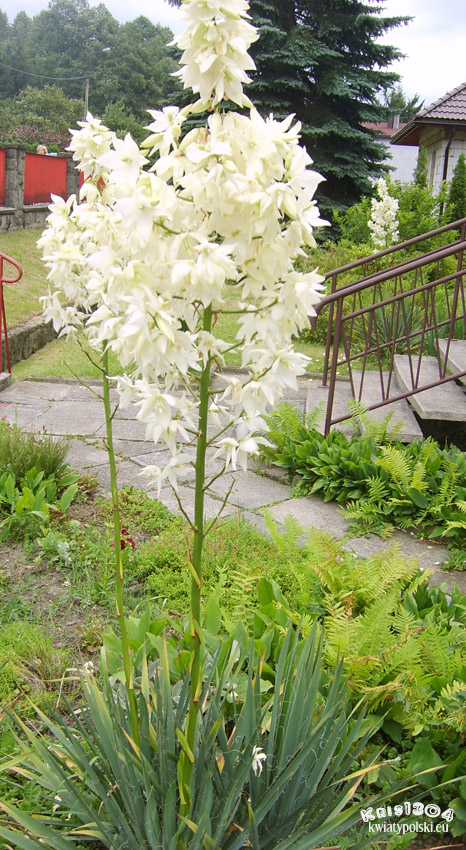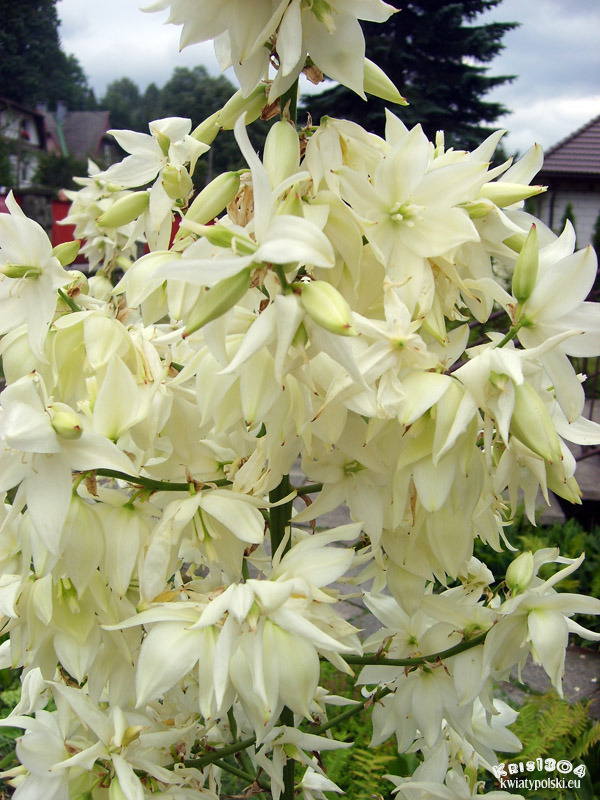 | OPIS | Kwiaty zebrane w okazały kwiatostan wyrastający latem ze środka dorosłej rozety. Ma on postać silnego, drewniejącego pędu wysokości 100-180 cm, z czego co najmniej połowa wysokości przypada na wiechowaty kwiatostan. Kwiaty są zwisłe, dzwonkowate, pachnące, długości 5-7 cm, w pąku zielonkawe, później kredowobiałe.