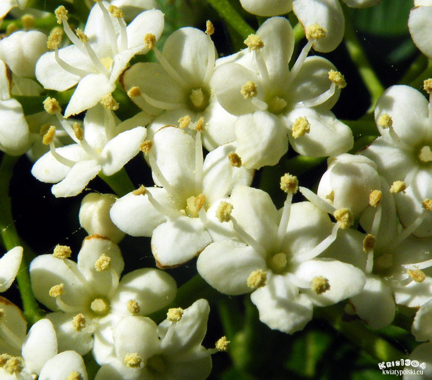 | OPIS | Kwiaty białe, zebrane na szczytach gałązek w baldachogrona. Wszystkie kwiaty są 5-płatkowe. Kielich niepozorny, z bardzo krótkimi ząbkami. Korona z krótka rurką i 5 łatkami. Pręcików jest 5.