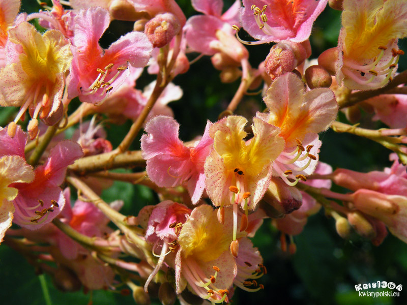 | OPIS | Kwiaty zebrane w bardzo liczne, podobnego kształtu i rozmiarów (do 20cm) jak u kasztanowca zwyczajnego stojące, stożkowate wiechy, różnią się od nich niejednolitym, różowoczerwonym kolorem. Odcień tego koloru jest zależny od odmiany i waha się od jasnozóżowego do ciemnoróżowoczerwonego.