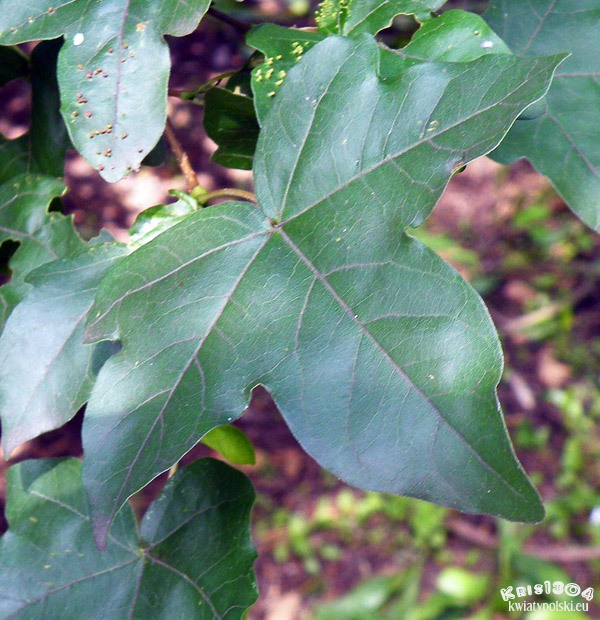 | LIŚCIE | Blaszkowate, pojedyncze. Blaszka o zmiennej formie, przeważnie w ogólnym zarysie okrągława, dłoniasto 3-5 klapowa, stosunkowo mała, szersza niż dłuższa: dł. 5-8 cm i szer. do 5-10 cm, matowo ciemnozielona (od spodu szarozielona), nieco skórzasta, owłosiona tylko w kątach nerwów na spodzie. Klapy jajowate, dość płytkie, całobrzegie lub łagodnie, falisto obrzeżone. Ustawienie naprzeciwległe na 2-7cm ogonkach. Ogonki wydzielają mleczny sok (ważna cecha rozpoznawcza).