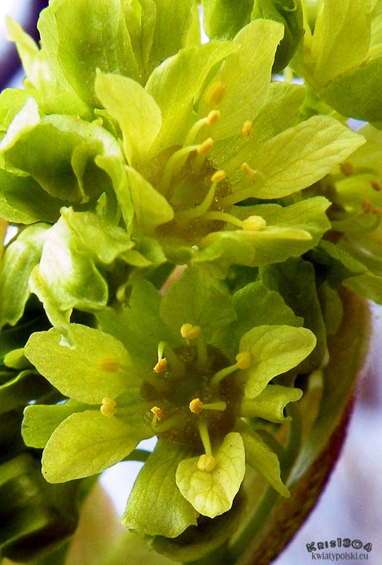 | OPIS | Kwiaty dość duże, obupłciowe, z dyskiem miodnikowym, zebrane w baldachogrona. Kielich 5-działkowy, korona zielonkawo-żółtawa, 5-płatkowa, pręcików 8, słupek 1. Płatki korony identyczne z działkami kielicha, o nieowłosionych brzegach.