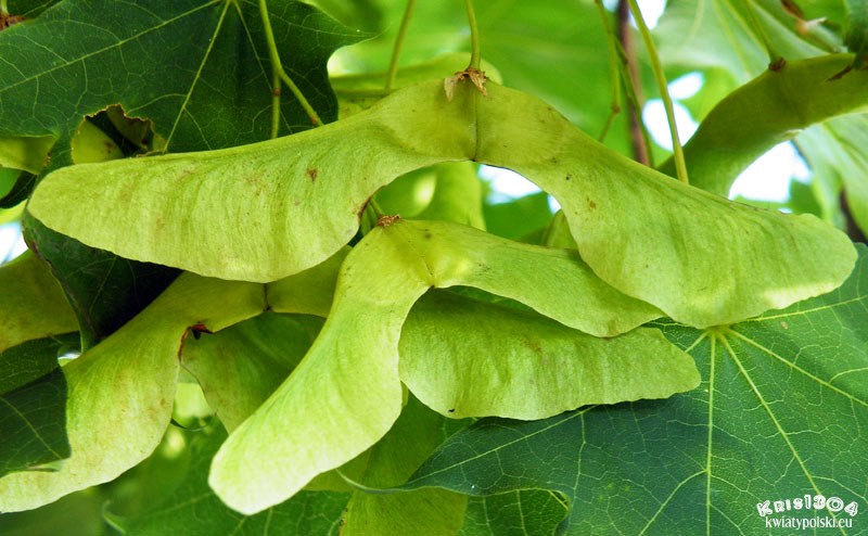 | OWOCE | Podwójne skrzydlaki z dużymi, płaskimi (różnica w stos. do jawora) orzeszkami i szerokimi skrzydełkami długości 4-5 cm, ustawionymi pod kątem mocno rozwartym (co najmniej 120°), początkowo jasnozielonymi, po dojrzeniu brązowymi.