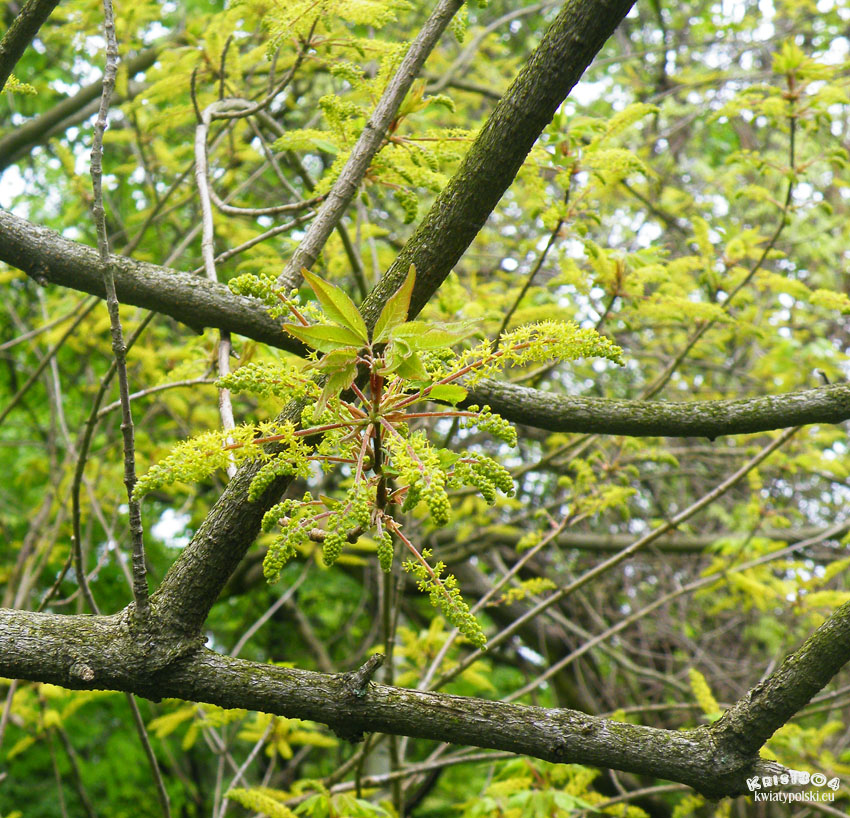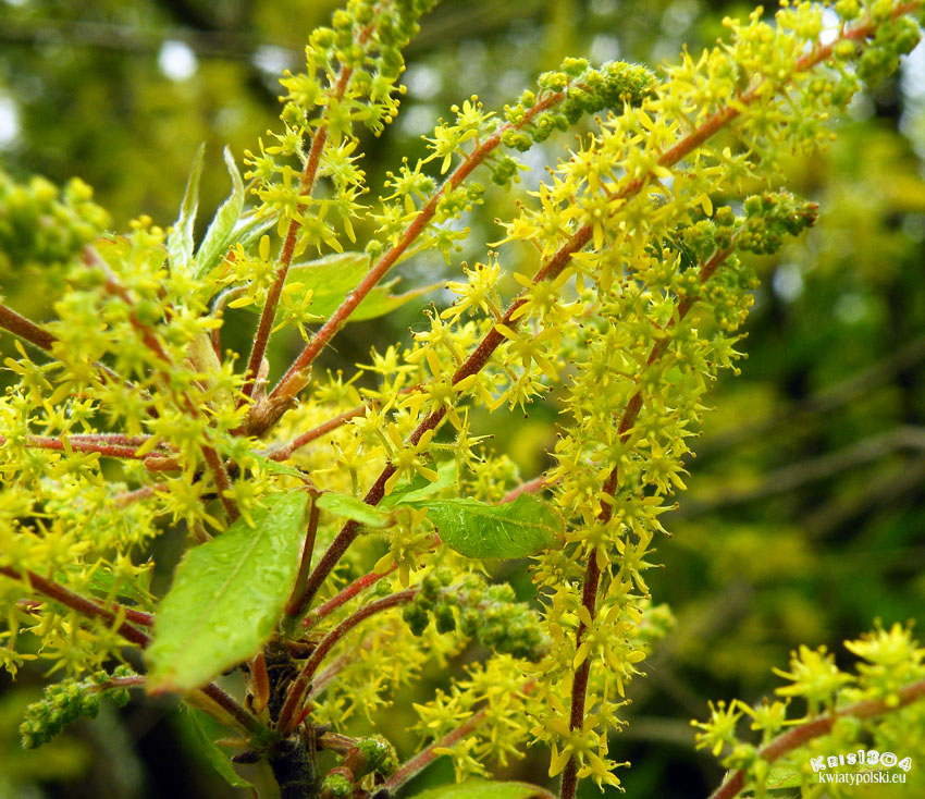 | OPIS | Kwiatostany męskie i żeńskie znajdują się na osobnych roślinach. Kwiaty są drobne i żółte, a same kwiatostany są zwisające. Mają około 10 cm długości.