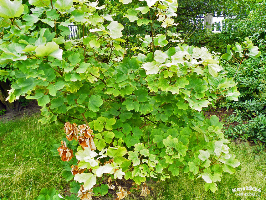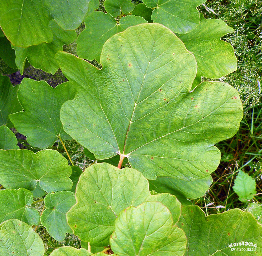| LIŚCIE | Dłoniasto klapowane z 3-5 klapami, na brzegu tępo ząbkowane, czerwonobrązowe, błyszczące, dołem omszone.