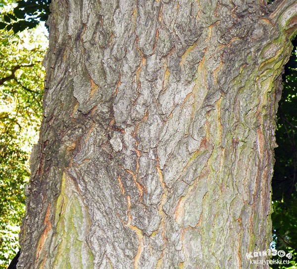 | KORA, PĘDY | Ma bardzo grubą i głęboko spękaną, szaroczarną korę.