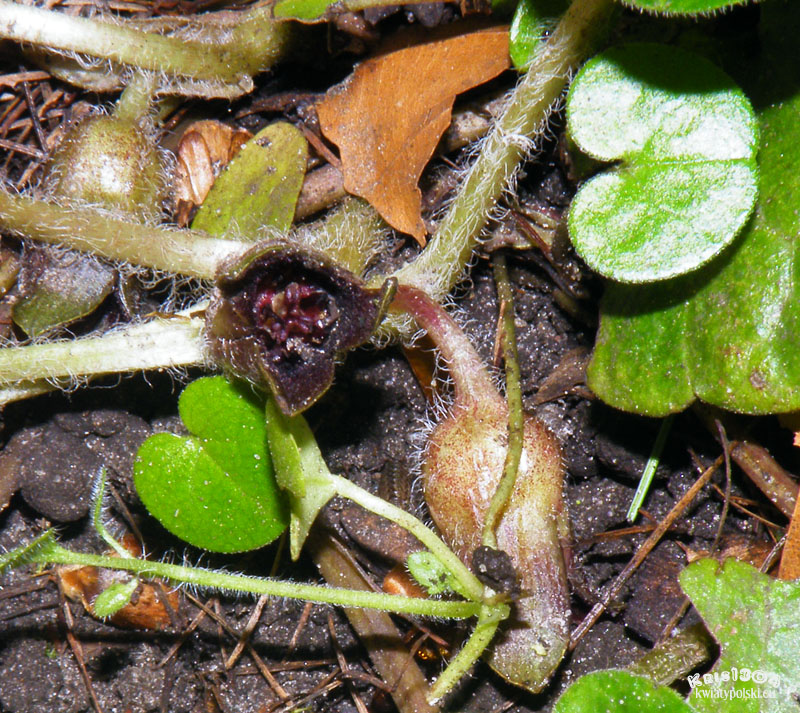 | OPIS | Kwiaty pojedyncze, dzwonkowatego kształtu, mięsiste, wyrastają tuż przy ziemi, zwisając na szczytach krótkich szypułek. Ukryte są zwykle pod liśćmi i często leżą na ziemi. Z zewnątrz mają kolor zielonopurpurowy (zalążnia w dolnej części jest zielona i owłosiona), od wewnątrz są ciemnopurpurowe. Kwiaty mają 3 zrosłe u dołu listki okwiatu o długości 1-1,5 cm.
