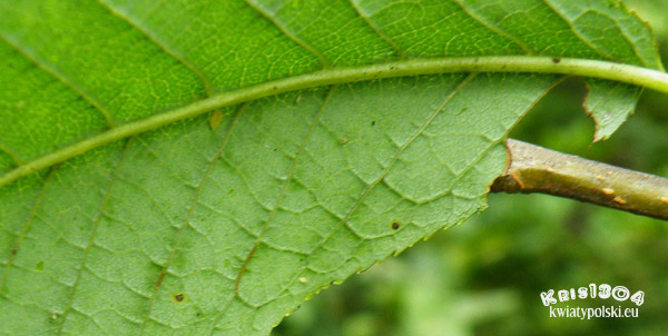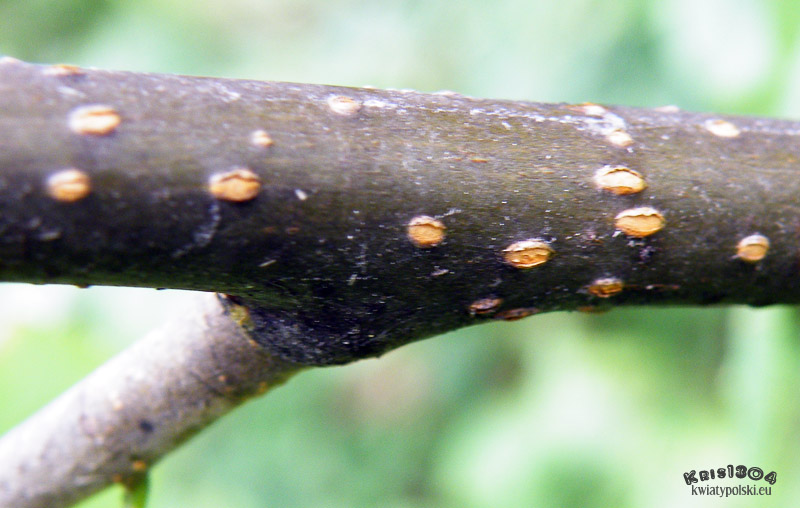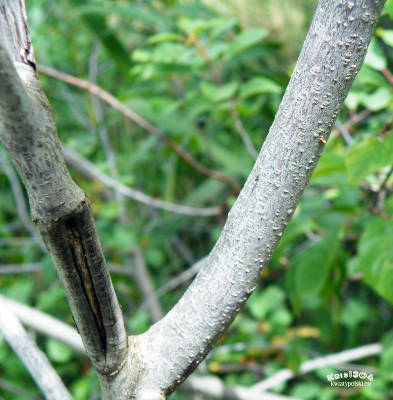 | KORA, PĘDY | Gałązki cienkie. Kora na młodych gałązkach owłosiona, brązowobrunatna, na starszych matowa, szarobrunatna i pokryta jasnymi plamkami - przetchlinkami.