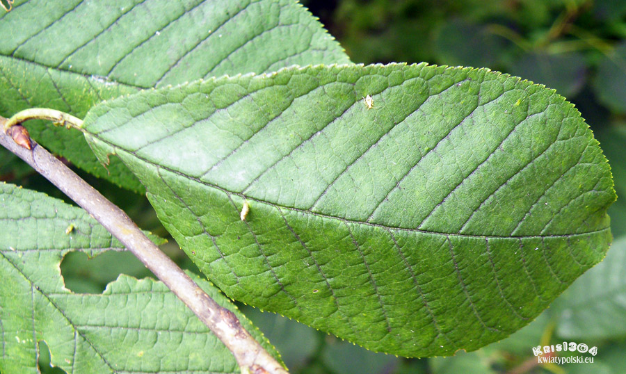 | LIŚCIE | Liście ogonkowe, ustawione skrętolegle, długości od 3 do 7 cm. Blaszka liściowa szerokoeliptyczna lub odwrotnie jajowata, całobrzega, tępa lub zaostrzona. Po obu stronach nerwu głównego 6-9 łukowatych nerwów bocznych. Na górnej stronie liście są ciemniejsze, na spodniej jaśniejsze, żółtawozielone. Liście są nagie, tylko na nerwach owłosione. Jesienią przebarwiają się na kolor jasnożółty. Pączki bez łusek.