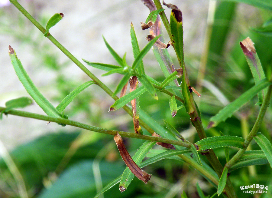 | LIŚCIE | Wąskolancetowate, siedzące, z zaostrzonymi szczytami. Mają szerokość do 6 mm, są nagie, do połowy długości bardzo drobno piłkowane, w drugiej połowie silniej piłkowane.