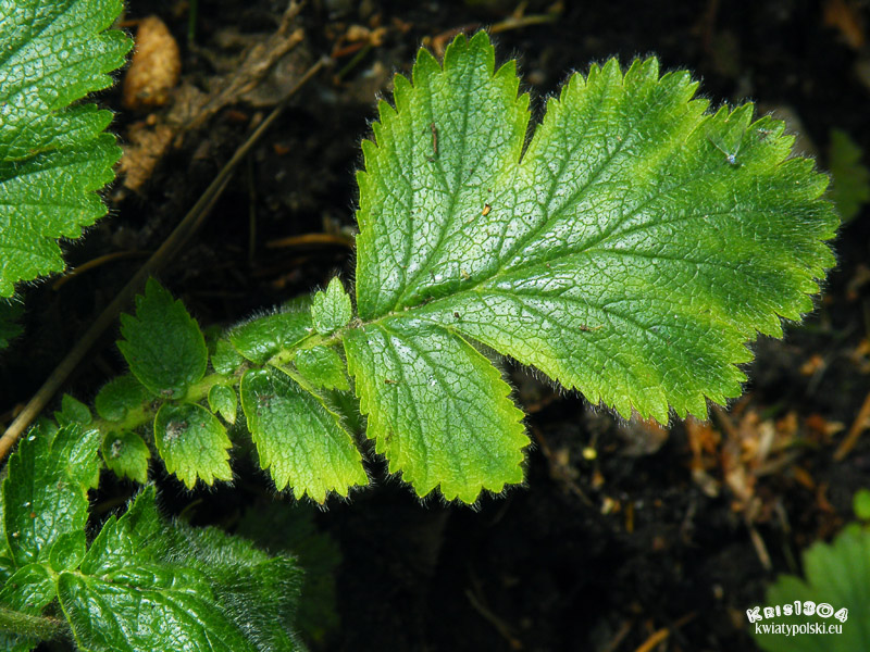 | LIŚCIE | Zebrane w rozety, wyrastające z kłącza. Liście te są przerywano-pierzaste. Składają się z karbowanych listków, których wielkość wzrasta od nasady liścia ku jego szczytowi. Listek szczytowy jest zdecydowanie większy od pozostałych. Oprócz liści różyczkowych na łodydze występują 3-6 małych liści łodygowych z większymi od nich, wcinanymi przylistkami.