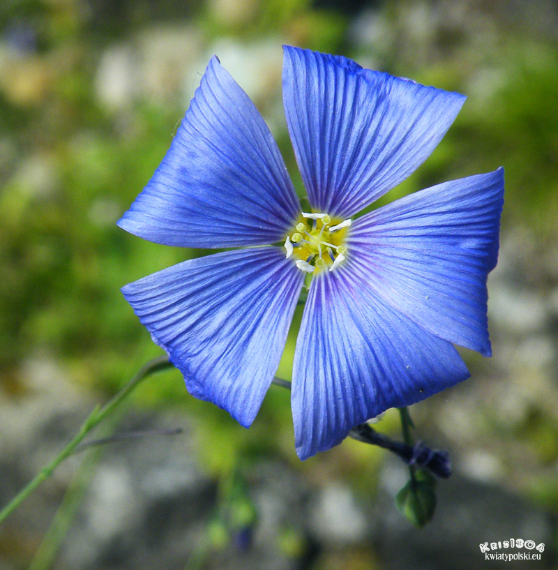| OPIS | Kwiaty na długich szypułkach. Na jednej łodydze przeważnie kilka kwiatków. Działki kielicha o kształcie jajowato-lancetowatym i obłonione. 5 niebieskich płatków korony. Słupki z maczugowatymi znamionami, kilka pręcików o nasadach zrośniętych w rurkę oraz kilka prątniczków. Owocem jest torebka ok. półtora raza dłuższa od kielicha. Po dojrzeniu torebek ich szypułki są wyprostowane, lub nieznacznie tylko zgięte. Nasiona o długości do 5 mm, jednostronnie oskrzydlone.