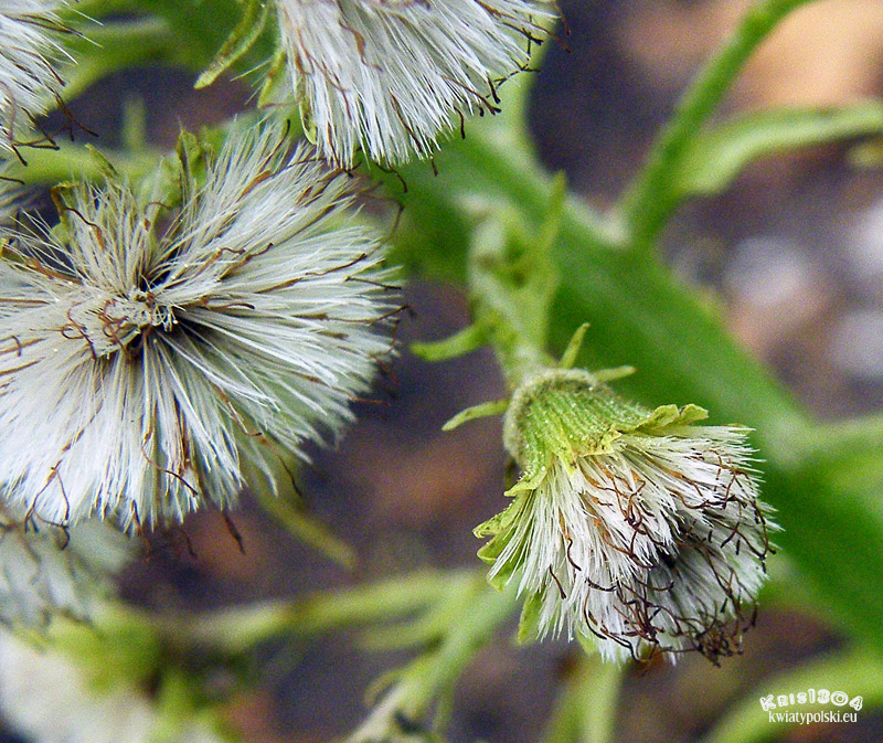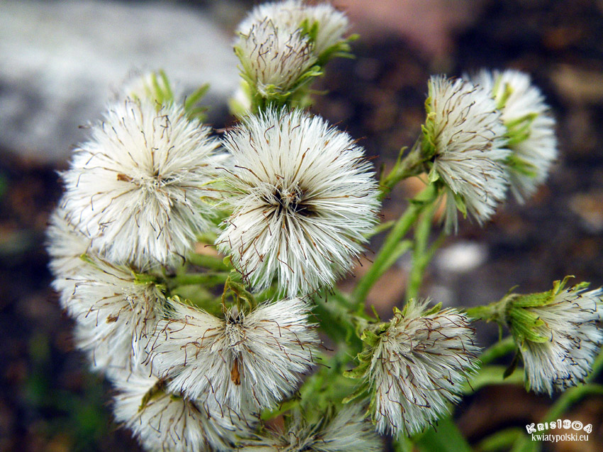 | OPIS | Drobne kwiaty zebrane są w koszyczki, a te w grona na szczycie łodygi. Kwiaty żeńskie składają się tylko ze słupka o długiej szyjce i dwudzielnym znamieniu, oraz z puchu (powstałego z przekształconego okwiatu). Kwiaty męskie mają koronę z 5 płatkami, zrośniętymi dołem w rurkę, pręciki zrośnięte w rurkę, oraz niepłodny słupek. Czasami w koszyczkach męskich występuje kilka kwiatów żeńskich.