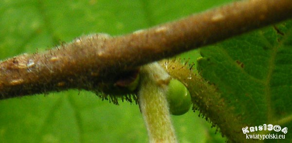 | LIŚCIE | Blaszkowate, pojedyncze. Blaszka okrągława do szeroko odwrotnie jajowatej, u nasady lekko sercowata, na końcu z krótkim, acz wyraźnie zaznaczonym wierzchołkiem, dość duża - o średnicy 8-12 cm, na brzegu głęboko i ostro podwójnie piłkowana (czasami częściowo wrębna), matowo zielona, miękka i delikatna w dotyku, z góry lekko pomarszczona, początkowo obustronnie miękko owłosiona, z czasem na wierzchu łysiejąca. Ustawienie skrętoległe na krótkich, ok. 1 cm, gruczołkowato owłosionych ogonkach.