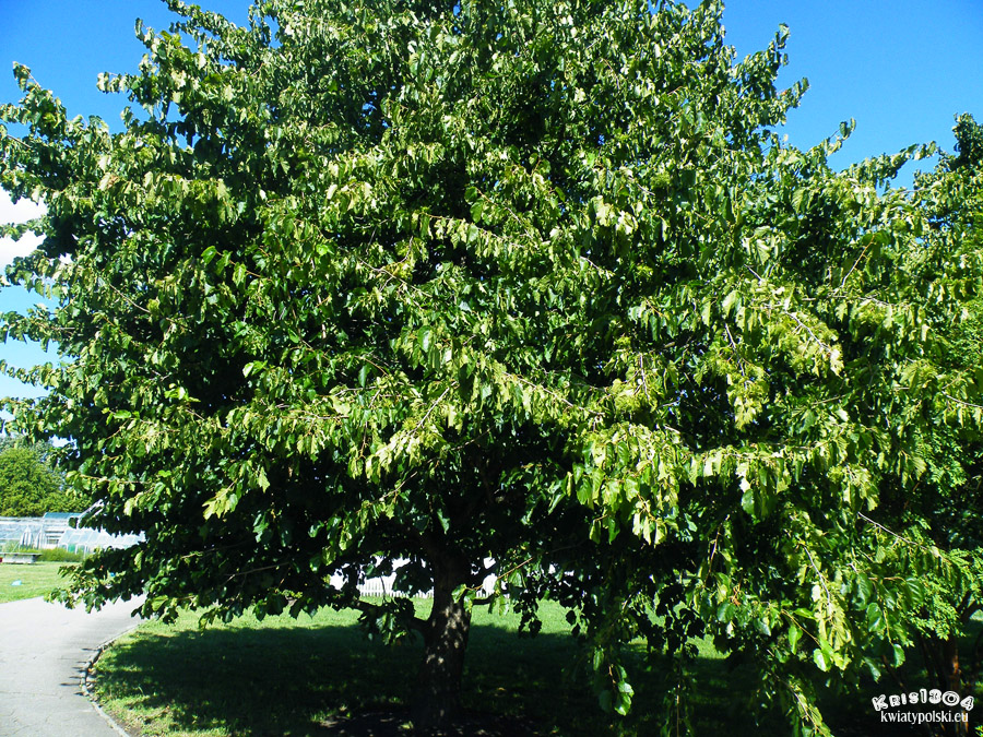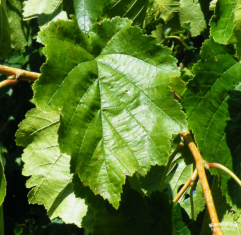 | LIŚCIE | Opadające na zimę, skrętoległe, szerokojajowate, ciemnozielone, jesienią złocistożółte. Długości 8-12 cm i prawie takiej samej szerokości. Z przodu krótko zaostrzone, na brzegach podwójnie ząbkowane lub wrębne.