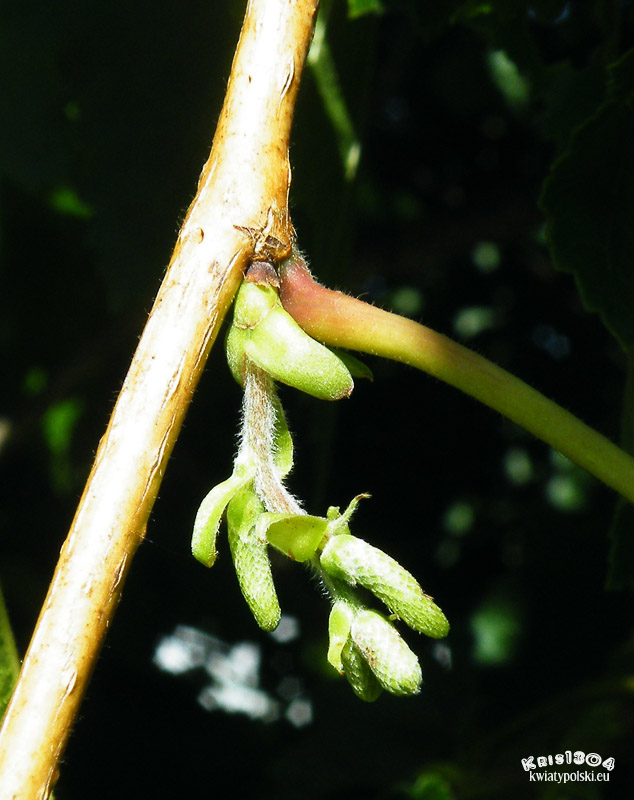 | OPIS | Roślina jednopienna. Kotki męskie o długości 8-12 cm, nagie, zielone lub jasnożółte. Kwiaty żeńskie w postaci pączka, w czasie kwitnienia rozpoznawalne tylko po długich, wystających, zwykle karminowoczerwonych znamionach.