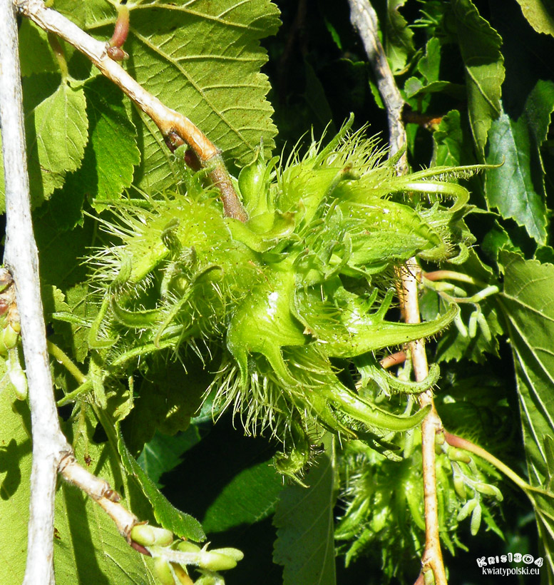 | OWOCE | Orzechy zebrane po kilka, każdy otoczony frędzelkowatą okrywą owocową, do 2 cm długości. Łupina gruba i twarda. Owoce dojrzewają od września do października.