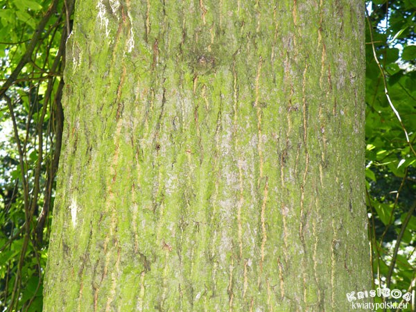 | KORA, PĘDY | Kora pokryta siecią rozgałęziających się podłużnych, niezbyt głębokich listewek. Pędy nagie, pąki duże nagie, okrągłoeliptyczne.