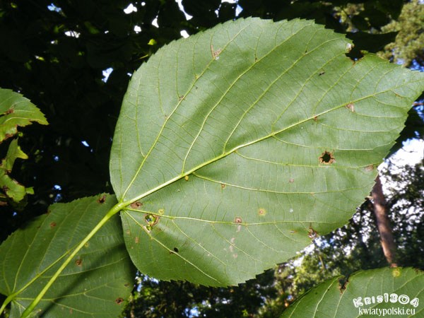 | LIŚCIE | Największe liście wśród lip, osiągają one ponad 20 cm długości i podobną szerokość. Z wierzchu blaszka zielona do ciemnozielonej, bardzo delikatnie owłosiona, od spodu przeważnie z gwiazdkowatymi kępkami włosków w kątach nerwów. Jesienią przebarwiają się na żółto.