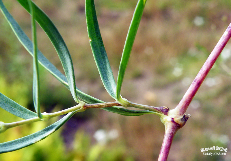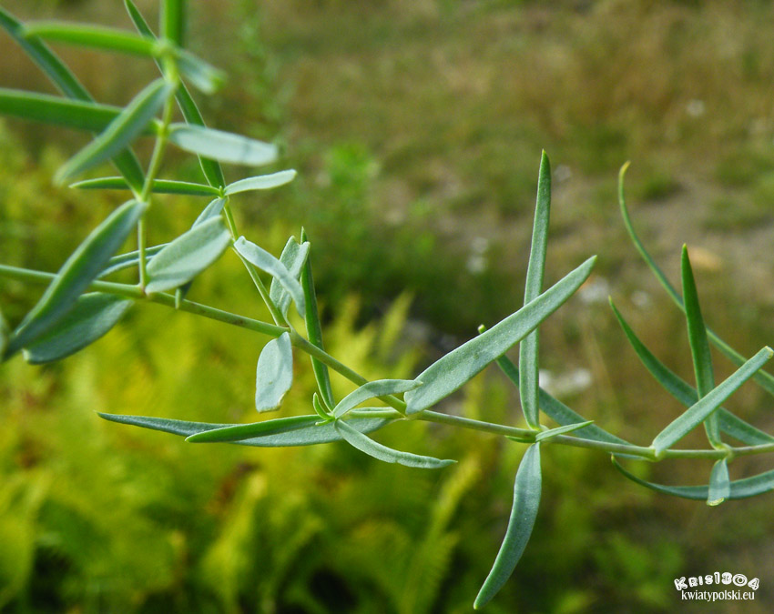 | LIŚCIE | Ulistnienie naprzeciwległe, liście równowąskie i zaostrzone, zrośnięte nasadami. Mają szerokość do 7,5 mm i 3-5 nerwów.