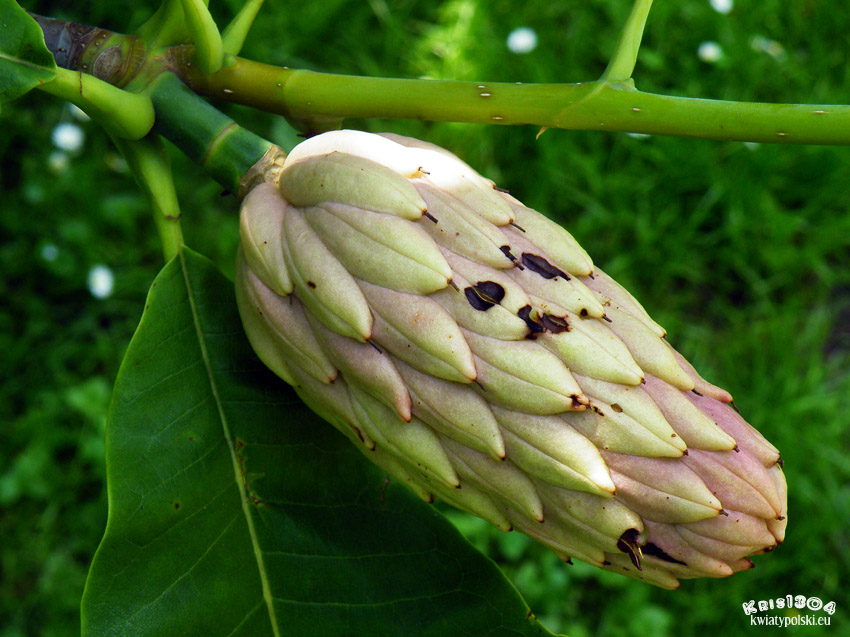 | OPIS | Duże kwiaty o średnicy do 25 cm mają biały, lub kremowy kolor i wyrastają na wierzchołkach pędów. Podobnie, jak u wszystkich magnolii brak zróżnicowania na kielich i koronę. Okwiat składa się z 12 płatków. w środku kwiatu liczne pręciki i słupki. Kwiaty pojawiają się już po rozwoju liści i mają nieco nieprzyjemny zapach.