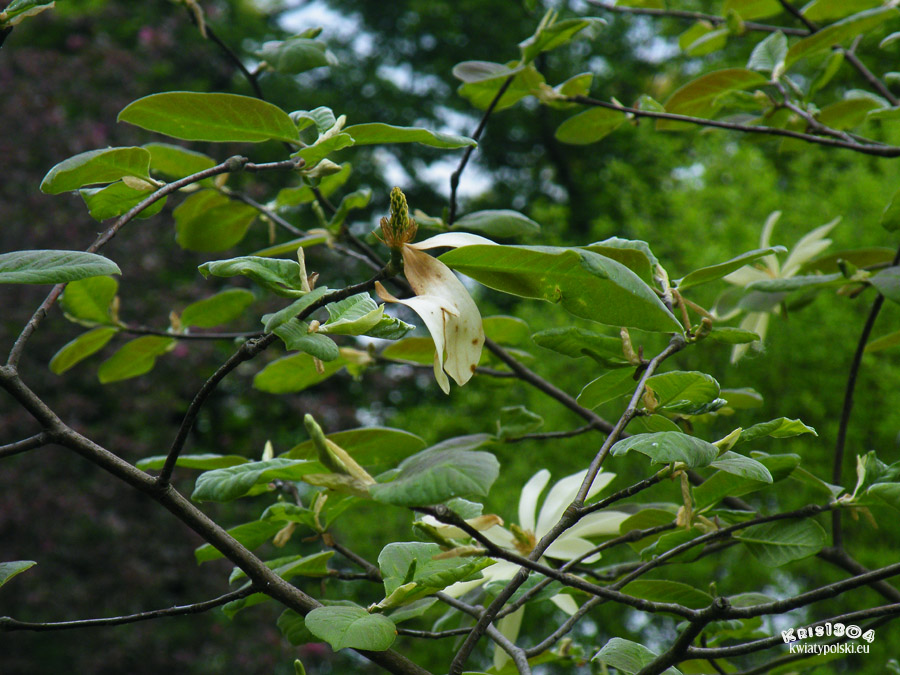 | LIŚCIE | Liście dość duże, pokryte obustronnie delikatnym meszkiem, młode barwy purpurowobrązowej - rzadko spotykanej wśród magnolii. Starsze liście zielenieją, a przed opadnięciem stają się czerwonawe.