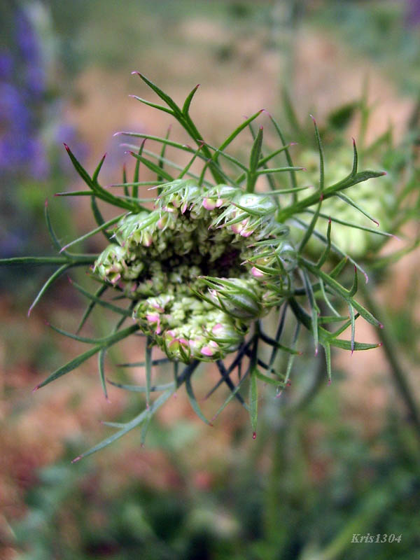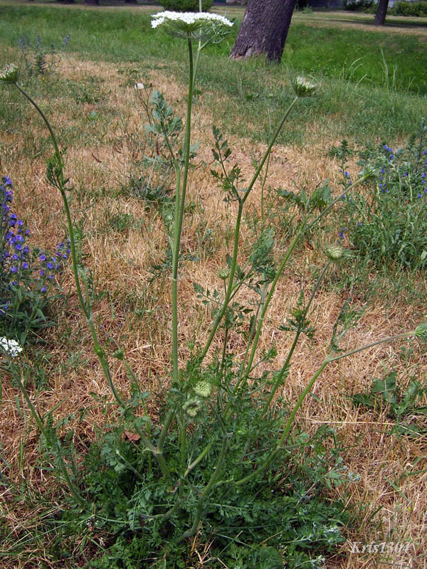 | OPIS | Środkowy kwiat baldaszku jest ciemno purpurowy. Płatki brzeżne kwiatów obwodowych baldacha wydłużone, szypuły baldaszków po przekwitnięciu stulone w postaci ptasich gniazd. W klimacie umiarkowanym w pierwszym roku wegetacji roślina tworzy różyczkę liści oraz gruby korzeń. W drugim roku z korzenia wybija łodyga z kwiatostanem, roślina wytwarza nasiona zużywając zawarte w korzeniu substancje zapasowe i obumiera.