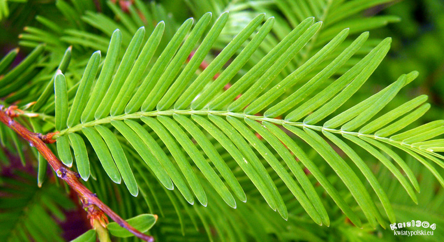 | LIŚCIE | Płaskie i bardzo miękkie, niekłujące. Ustawione dwurzędowo na naprzeciwległych krótkopędach . Poszczególne szpilki o długości 1 - 3 cm są równowąskie. W porze listnienia przybierają żywą, trawiastozieloną barwę, później są nieco ciemniejsze. Jesienią przebarwiają się na żółto, łososiowo- lub rubinowoczerwono. Opadają wraz z pędami zielnymi w czasie przymrozków.