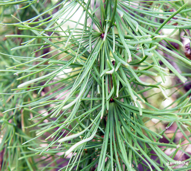 | LIŚCIE | Igły rosnące na czerwonobrązowych długopędach są pojedyncze, ułożone skrętolegle, rosnące na krótkopędach zebrane w pęczki po 40-60, o długości do 3,5-4 cm, płaskie, miękkie, szaro- lub niebieskawozielone, jesienią złocistożółte.