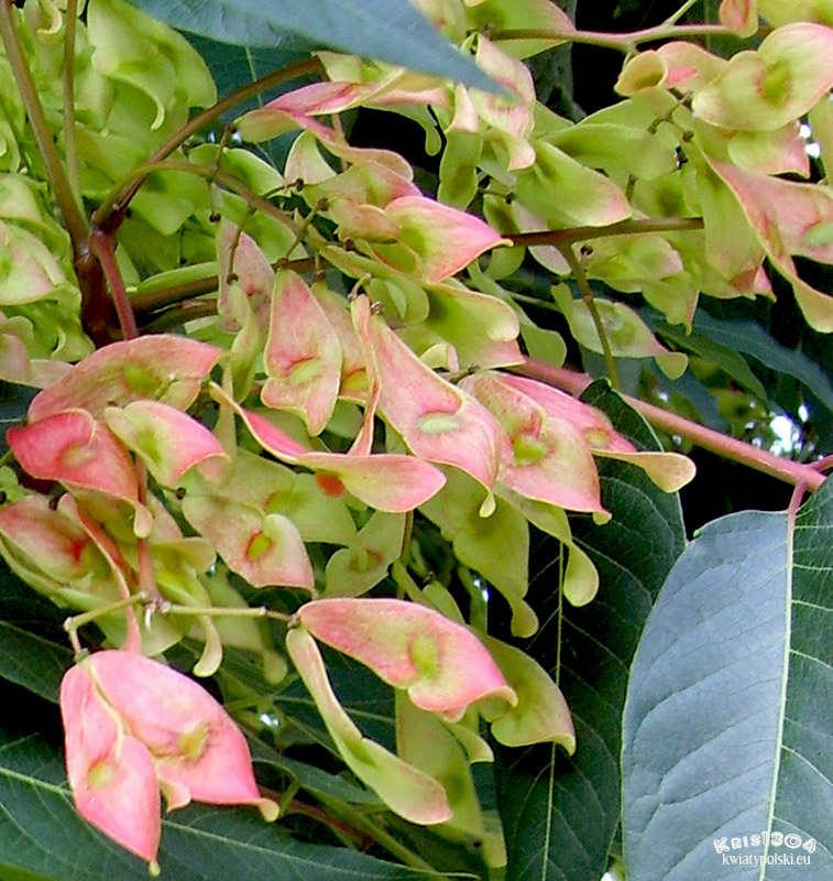 | OWOCE | Pojedyncze skrzydlaki z centralnie umieszczonym orzeszkiem. Są wytwarzane niezwykle obficie, zebrane po kilkadziesiąt sztuk tworzą duże i gęste, zwisające wiechy. Orzeszek wyraźnie widoczny (wypukły), umieszczony w środku poskręcanego skrzydełka o wymiarach ok. 4x1cm. W trakcie dojrzewania skrzydlaki przybierają bardzo efektowny, rudopomarańczowy lub czerwonopurpurowy kolor, z biegiem czasu zielenieją, a po dojrzeniu stają się jasnobrązowe.